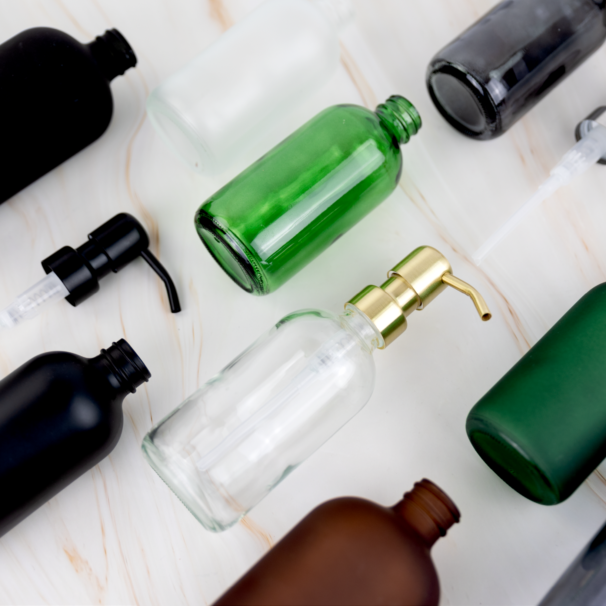 Tu reçois par set une bouteille en verre d'une contenance de 250ml ou 500ml ainsi qu'un embout de pompe en acier inoxydable dans la combinaison de couleurs de ton choix.