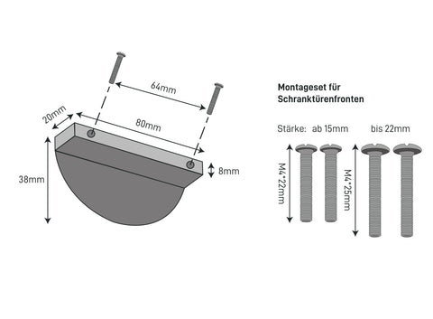 Pro Griff liegen zwei Schraube M4x25 sowie zwei M4x22 bei, welche je nach Tiefe der Front selbst gewählt werden können. Für die Wandmontage sind passende Schrauben mit Dübel enthalten.