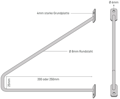 Unsere Regalhalter sind einfach zu montieren. Die seitlich offene Gestaltung sorgt für eine variable Länge des Einlegebretts, lediglich die Tiefe ist mit max. 200mm oder 250mm und die Brettstärke mit max. 25mm begrenzt.